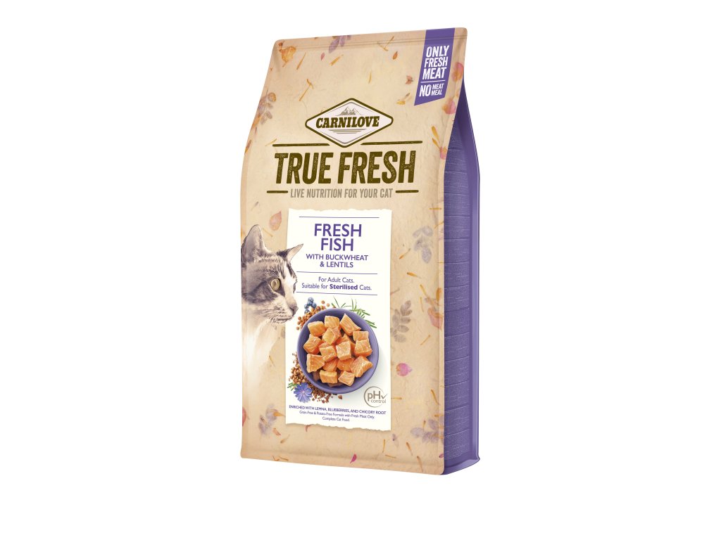 CARNILOVE TRUE FRESH FISH. Receptura bez obilovin a brambor pouze s čerstvým masem pro dospělé kočky. Vhodné pro kastrované kočky. Kompletní krmivo pro kočky.